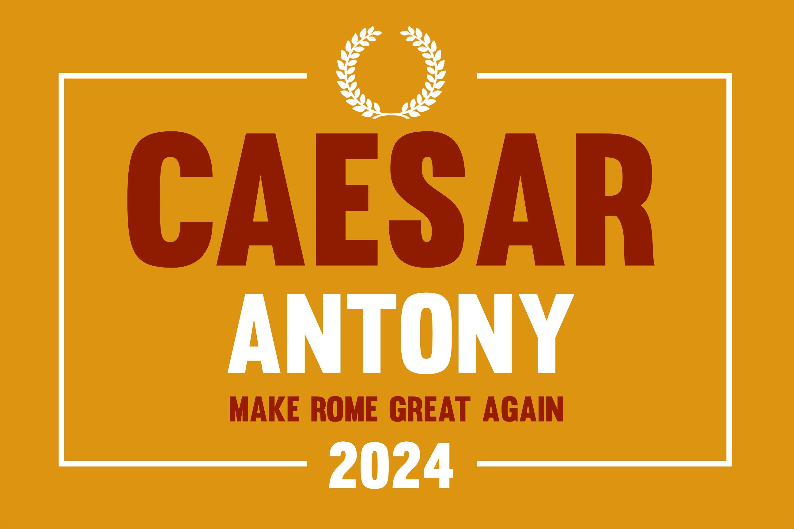 If you’d like to help support Bard in the Barracks, we’re running a silent auction fundraiser that will allow you to take home some of the unique prop and costume pieces that we have created for our contemporary take on Julius Caesar, which is inspired by current politics and world events particularly (but not exclusively) south of the border. Our auction features campaign-style signs and merchandise for Caesar-Antony 2024 (spoiler alert: Caesar doesn’t make it to the finish line for this election, making these items even more collectible!). So if our production inspires you to Make Rome Great Again, you’ll find just what you want! And for veteran Bard fans of old, we’ve thrown in a couple of similar collectors’ items from our 2015 production of Romeo and Juliet, in which the warring families were on opposite sides of that year’s NB election campaign.
