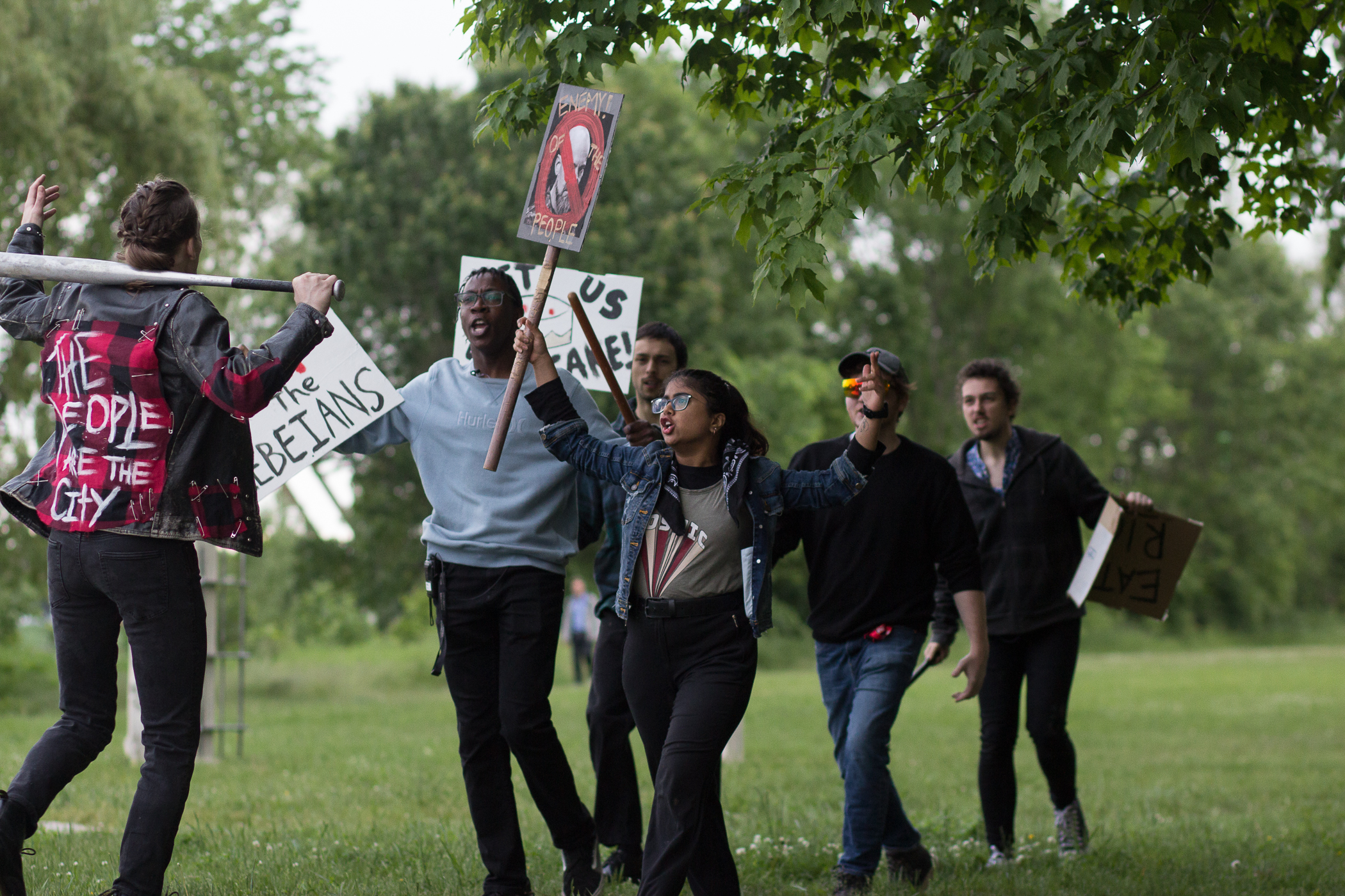 Exemplifying the contrasting nature of our two productions, Wiegers designs for The Tragedy of Coriolanus feature darker colours, military uniforms, and business attire to create a modern environment for this year’s downtown production.