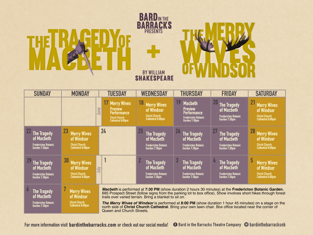 Performances for The Tragedy of Macbeth will begin at 7:30PM in the Fredericton Botanic Garden. A reduced-price preview performance will be held on Jun19, with subsequent performances happening on June 20, 22, 25, 26, 27, 29, July 2, 3, 4, & 6. To find the box office, follow the signs from the parking lot on 695 Prospect Street.