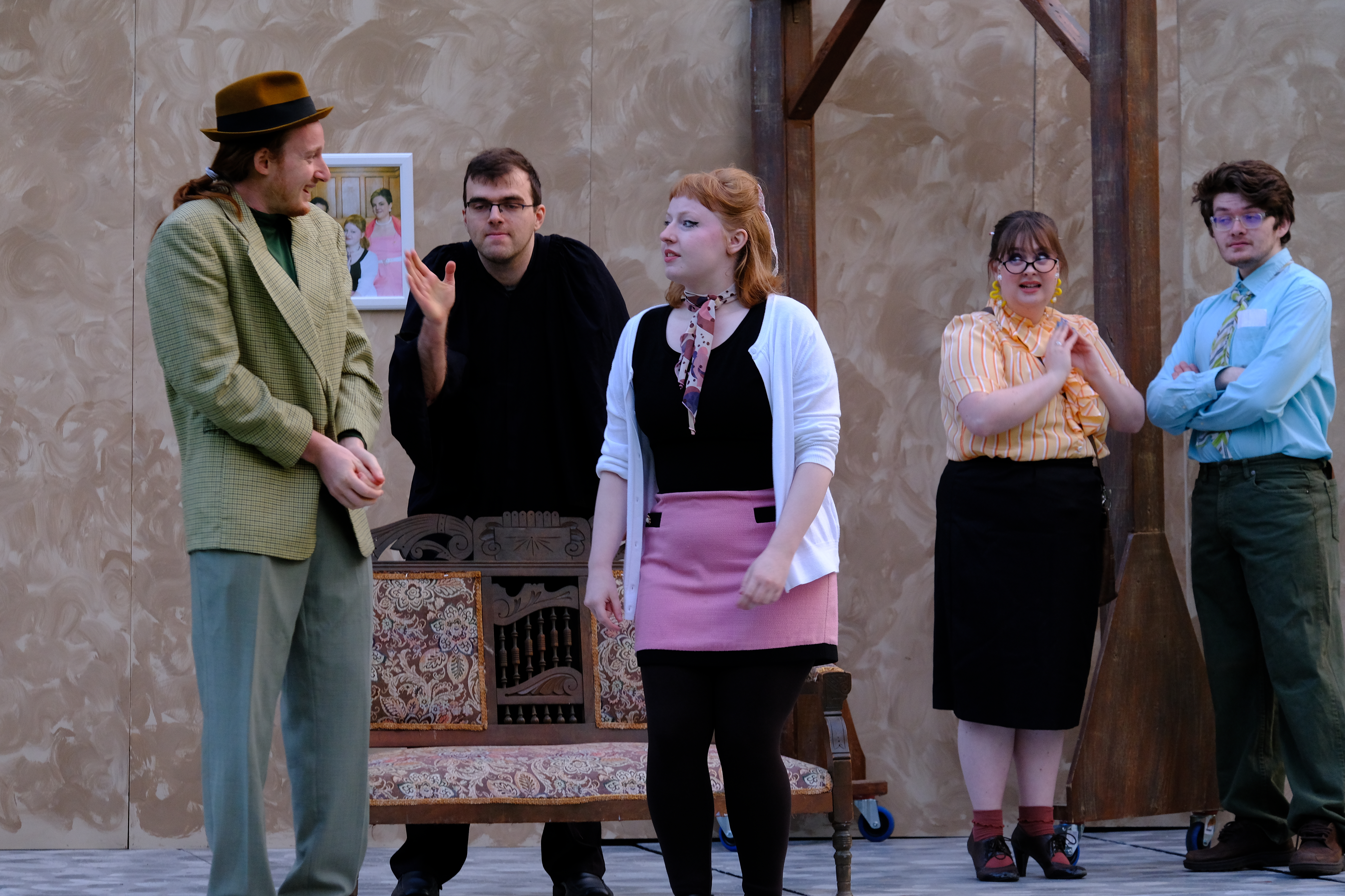 Since we decided to portray The Merry Wives of Windsor in the 1960s it was crucial that the costumes incorporate as many vibrant colours and patterns as possible to clearly distinguish the time period from the decades directly before and after. At the same time, I researched how famous mafia members of the time dressed and how they utilized more formal styles to create the assumption of a higher social status then they were born into. I also really enjoyed the process of costuming Falstaff because designing a costume to make a character look and feel unlikeable requires a very different approach than you typically would take for a leading character.